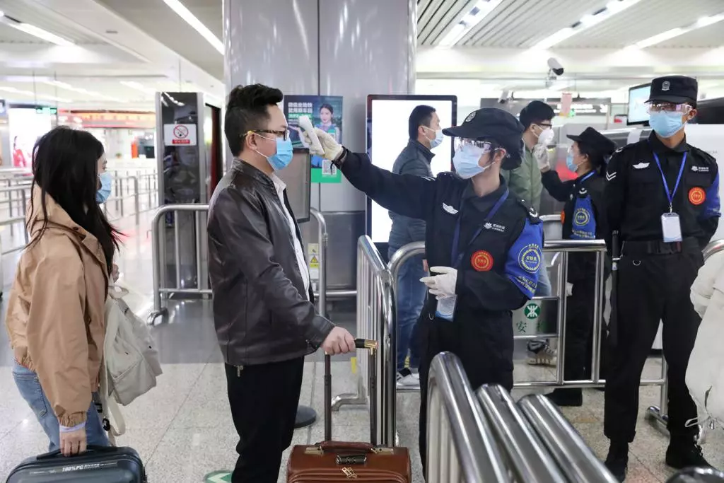 在地鐵站入口處,安檢人員測量乘客體溫。