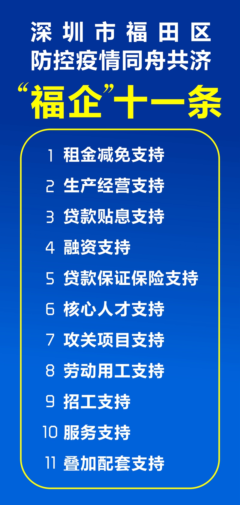 據(jù)福田區(qū)相關負責人介紹,“福企”11條是以“火線”方式誕生的,相關產(chǎn)業(yè)部門按照區(qū)委區(qū)政府的要求,早謀劃、早行動,短短4天,密集調(diào)研企業(yè)、行業(yè)協(xié)會,加班加點,聚焦企業(yè)存在的突出問題,急企業(yè)所急、想企業(yè)所想,推出了一份有擔當、有分量、有溫度、有針對性的政策。主要特點有: