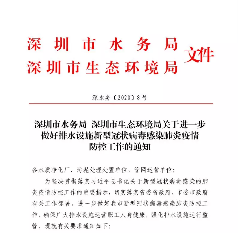 早在1月30日,深圳市水務(wù)局、深圳市生態(tài)環(huán)境局就聯(lián)合發(fā)布了《關(guān)于進(jìn)一步做好排水設(shè)施新型冠狀病毒感染的肺炎疫情防控工作通知》(以下簡(jiǎn)稱《通知》),提前部署,明確要求全市要全力以赴做好排水設(shè)施疫情防控工作。
