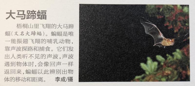 “我是在梧桐山附近仙湖植物園拍到的大馬蹄蝠。每到傍晚,仙湖植物園進出園區(qū)的那條路上,都有數量比較多的大馬蹄蝠在那飛。當時有幾棵樹在開花,我拍了好幾張終于抓拍到一張清晰的。”2月4日,李成在回憶當年拍攝經歷時說,當時蝙蝠群距離他最近的有2-3米,最遠的有10多米。