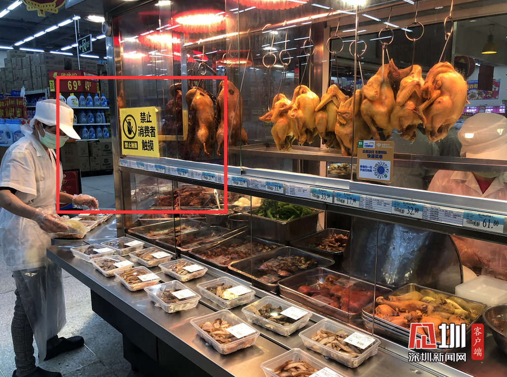 《公告》中提到,禁止商場、超市、糕點(diǎn)店、水果店提供食品“試吃”服務(wù)。記者看到,景田北沃爾瑪超市熟食區(qū)有明顯禁止消費(fèi)者觸摸等標(biāo)志?!耙咔榉揽仄陂g,我們是禁止給市民提供試吃的?!蔽譅柆斚嚓P(guān)負(fù)責(zé)人說道。