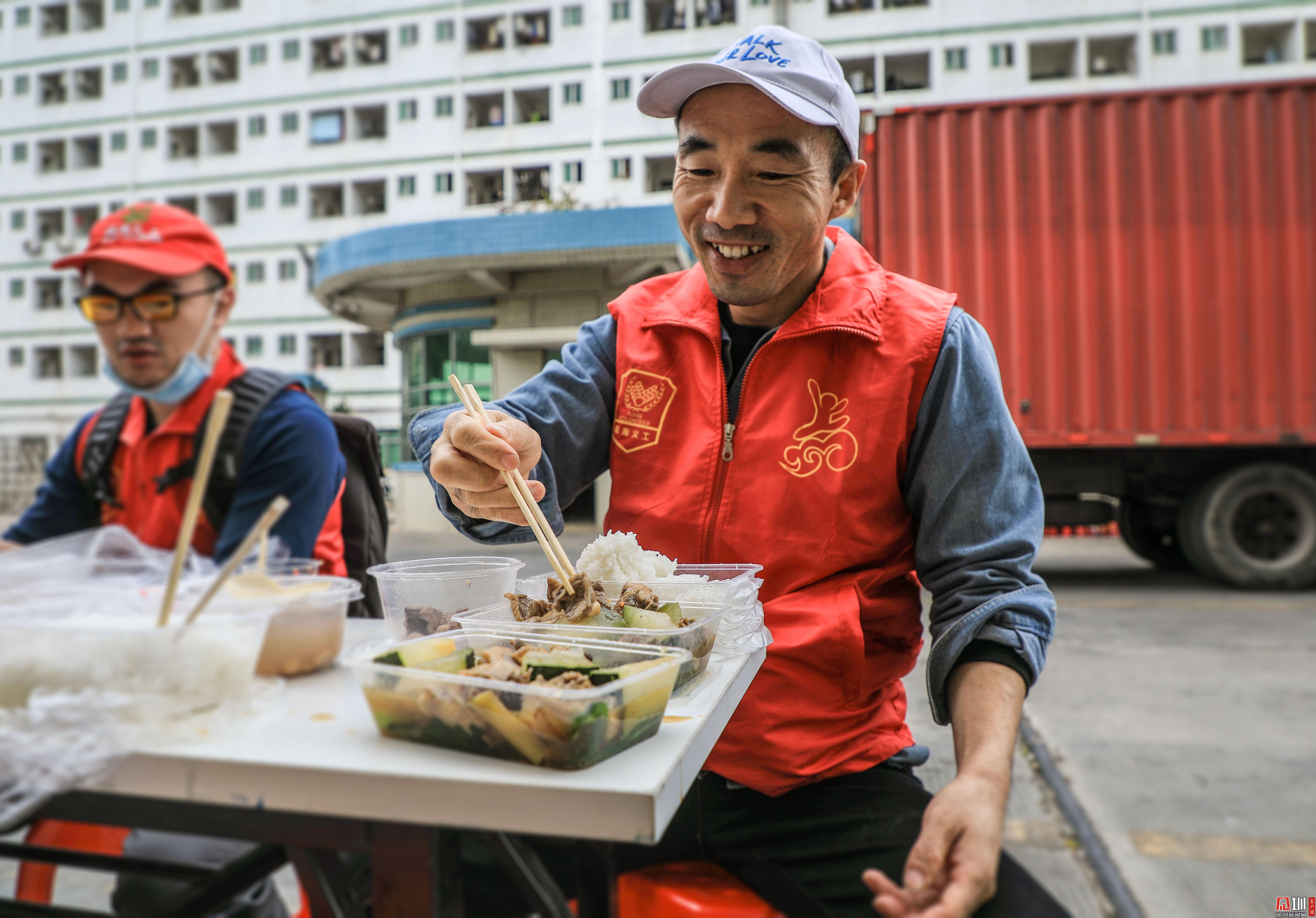 擺好桌子后,郭建庚便去排隊為義工們領來午餐,在工廠門口負責幫忙招工的兩位義工不能離崗,郭建庚便把午餐另外給他們送了過去。