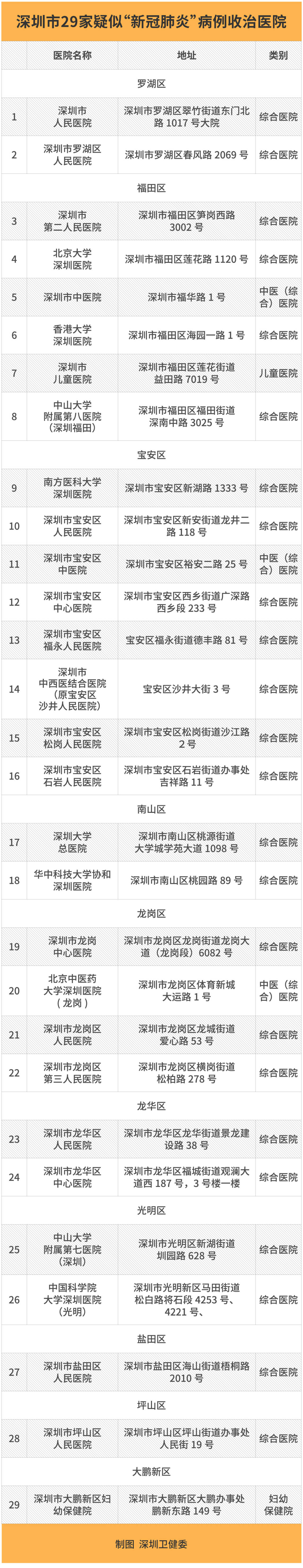 如果患者符合疑似病例條件,應就地隔離。與此同時,醫(yī)院會立即將患者情況上報,并同步報告至所在區(qū)域收治醫(yī)院。目前,深圳已經發(fā)布了29家疑似病例收治醫(yī)療機構名單,市級收治醫(yī)院主要負責本院就診的疑似病例的集中收治,區(qū)級收治醫(yī)院主要負責本院就診及接收轄區(qū)區(qū)屬醫(yī)院、社會辦醫(yī)院和社區(qū)健康服務中心等基層醫(yī)療機構轉診的疑似病例的集中排查和收治。