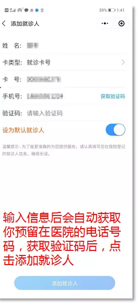 患者首次進(jìn)入診室,需添加就診人,輸入在醫(yī)院的就診信息,綁定身份。