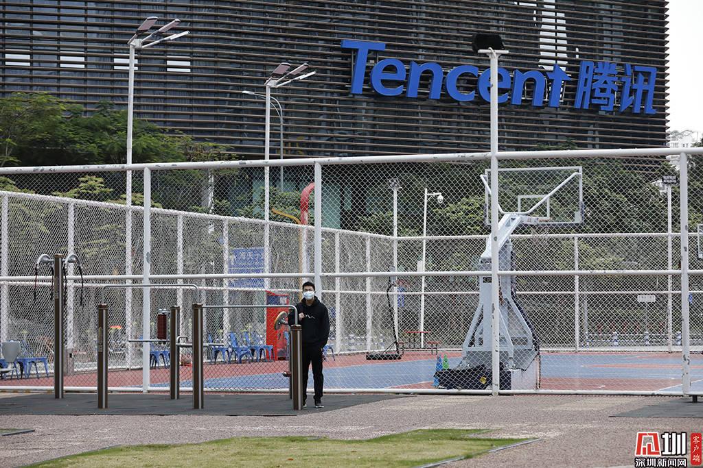 騰訊大廈的一個入口處,工作人員正在檢測體溫。