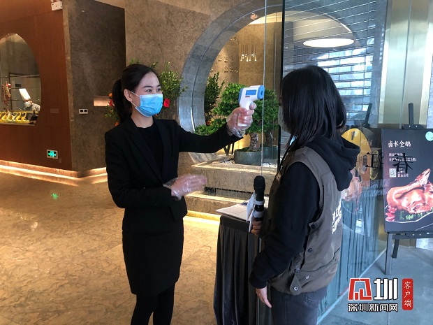 春江潮餐廳對(duì)進(jìn)店人員測(cè)量體溫。