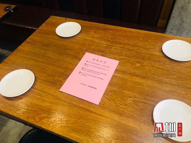桌子上貼有防疫公告。