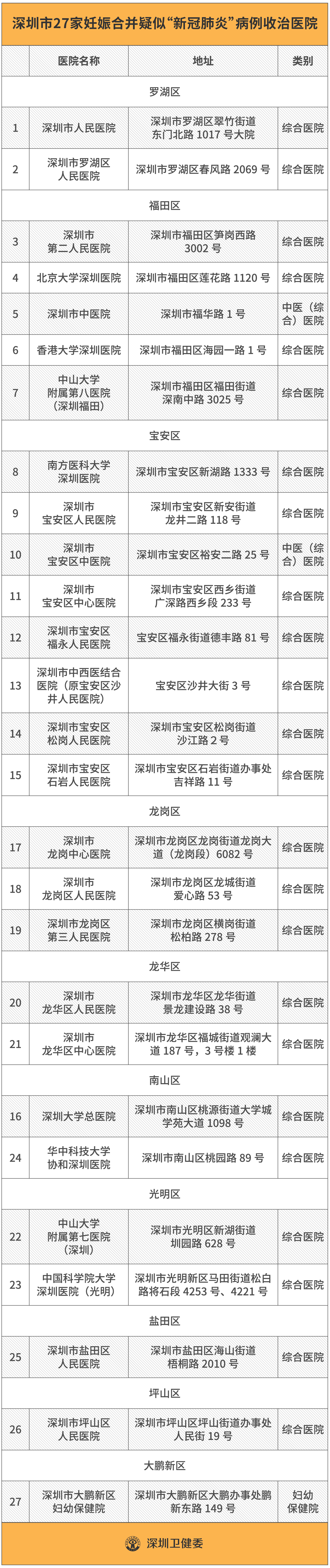 據悉,深圳共有27家妊娠合并新型冠狀病毒感染感染疑似病例市、區(qū)級收治醫(yī)院,其中,市級醫(yī)院8家,區(qū)級醫(yī)院19家,覆蓋深圳10個區(qū)(新區(qū))。