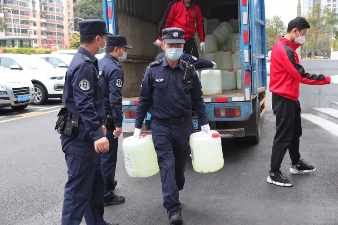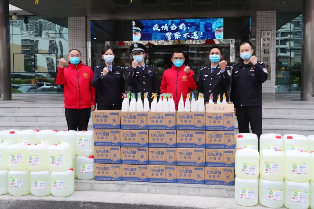 當(dāng)天16時許,愛心企業(yè)代表肖先生帶著50桶20公斤消毒液、480瓶消毒酒精、20個噴壺來到了福田分局,捐贈給了福田警方。福田分局黨委委員、政治處主任桂禮強(qiáng)代表分局接收捐贈抗疫物資,并對愛心企業(yè)表示感謝。
