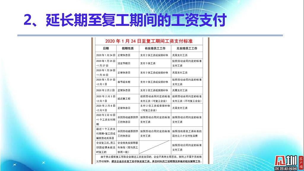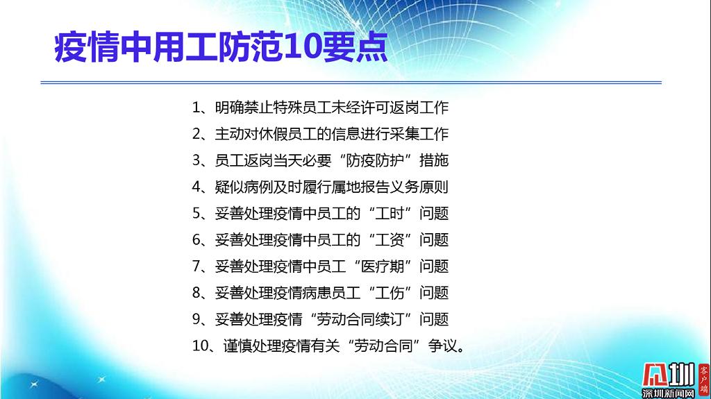 見圳客戶端?深圳新聞網(wǎng)2020年2月18日訊(見圳客戶端、深圳新聞網(wǎng)記者 焦慧茹)疫情影響了社會(huì)的方方面面,給企業(yè)和職工帶來了新的問題。對于廣大職工而言,擔(dān)心的是疫情期間工資發(fā)放、復(fù)工安排等。對于企業(yè)而言,擔(dān)心的是如何順利復(fù)工復(fù)產(chǎn)。為此,深圳市總工會(huì)聯(lián)合深圳新聞網(wǎng)推出“復(fù)工防疫微課堂”第六期,邀請講師楊文浩,分析、整理了疫情之下企業(yè)復(fù)工用工防范要點(diǎn),幫助大家解決困惑。