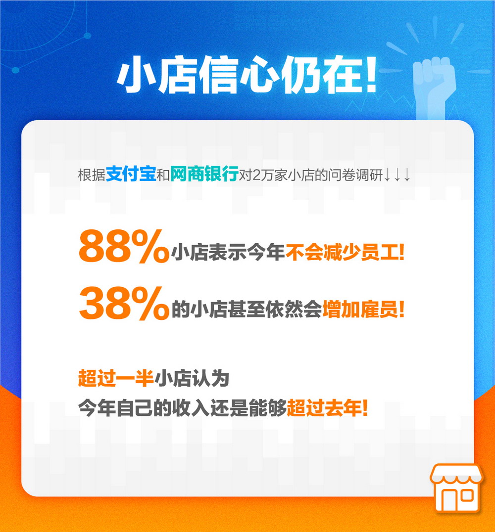 根據(jù)支付寶和網(wǎng)商銀行對20000家小店的問卷調(diào)研,88%小店表示,今年不會減少員工,38%的小店表示,依然會增加雇員;超過一半小店認(rèn)為今年自己的收入還是能夠超過去年。