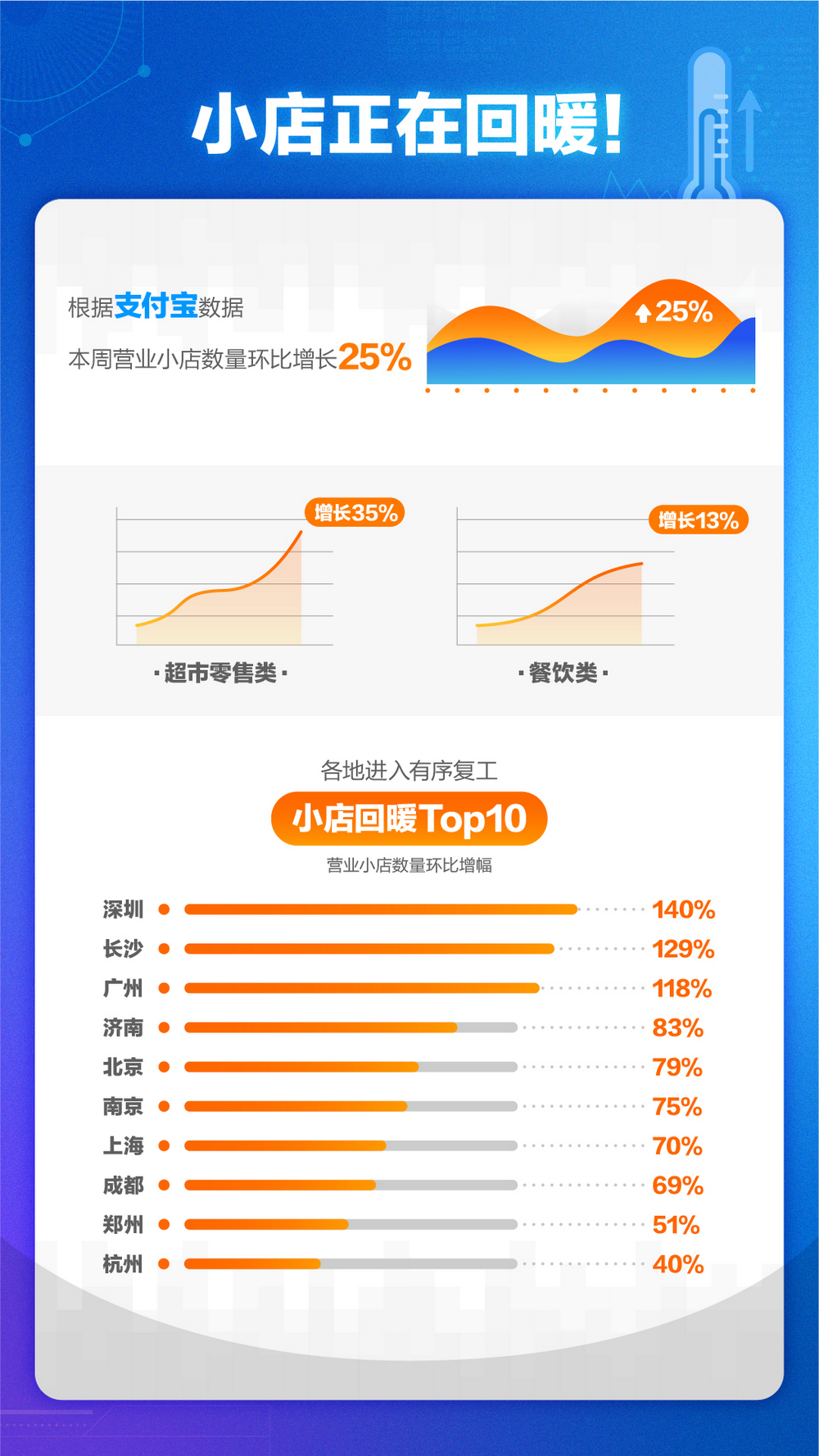 見圳客戶端·深圳新聞網(wǎng)2020年2月19日訊(見圳客戶端、深圳新聞網(wǎng)記者 陳婕)本周全國迎來新一輪復(fù)工潮,來自支付寶的最新數(shù)據(jù)顯示:本周營業(yè)小店數(shù)量環(huán)比增長25%,與百姓生活關(guān)聯(lián)度緊密的超市零售類小店,增幅達到35%。其中,深圳、長沙、廣州的增幅最大,位列前三。