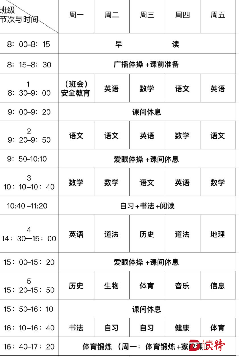 平安里學(xué)校初中生覃予墨的網(wǎng)課課程表。