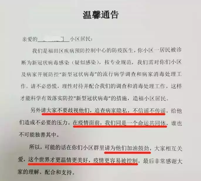 “疫情面前,我們同是一個命運共同體”“大家相互關愛,這個世界才更溫情美好,疫情更容易被控制……”1月30日,位于深圳福田區(qū)的一小區(qū)出現新冠肺炎疑似感染病例,福田區(qū)疾病預防控制中心的防疫醫(yī)生隨即發(fā)布了這則通告,瞬間刷屏了深圳人的朋友圈。通告除了呼吁小區(qū)居民配合調查及消毒處理工作外,還特地懇請大家“不要歧視,在疫情面前,我們是同一個命運共同體,誰也不可能獨善其身?!绷攘葦底值摹罢埱蟆?,感動無數人。