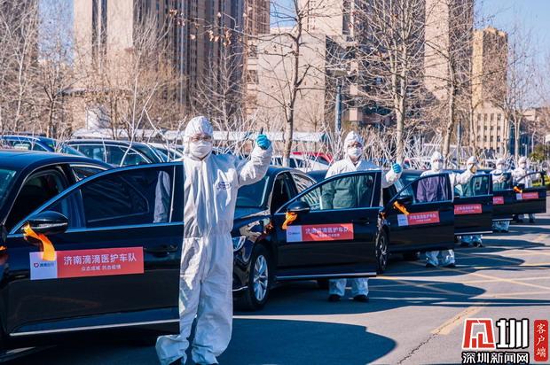 山東濟南滴滴醫(yī)護車隊司機為醫(yī)護人員提供免費接送服務。