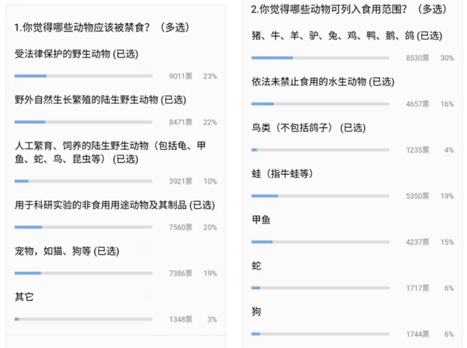 可以對照來看的是第2道多選題(你覺得哪些動物可列入食用范圍?),19%的網(wǎng)友認為牛蛙應(yīng)該可食用才對,這個選項有5395票。15%的網(wǎng)友對甲魚可食用投贊成票,票數(shù)為4237票。贊成吃蛇和狗的比例略小,為6%左右。