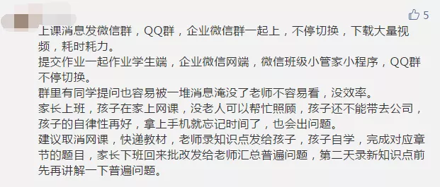 有家長建議,老師可以將知識點逐個講解后,由孩子自學(xué)并完成作業(yè),之后再將作業(yè)中存在的普遍問題進(jìn)行集中解答。