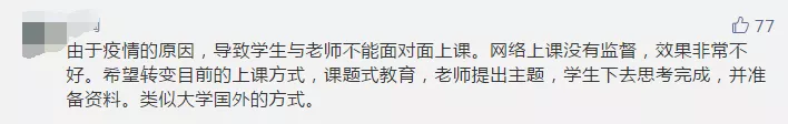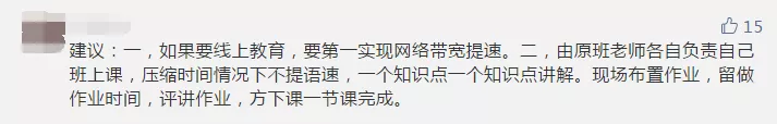 在疫情期間,如何做好“停課不停學(xué)”,許多參與者也給出自己的建議。有家長建議將目前的上課形式轉(zhuǎn)變?yōu)椤罢n題式教育”,即由老師出主題,學(xué)生獨立思考完成。