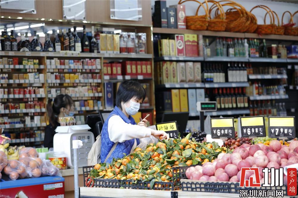 一個(gè)水果店中,一位戴著口罩的市民正在選購(gòu)水果。