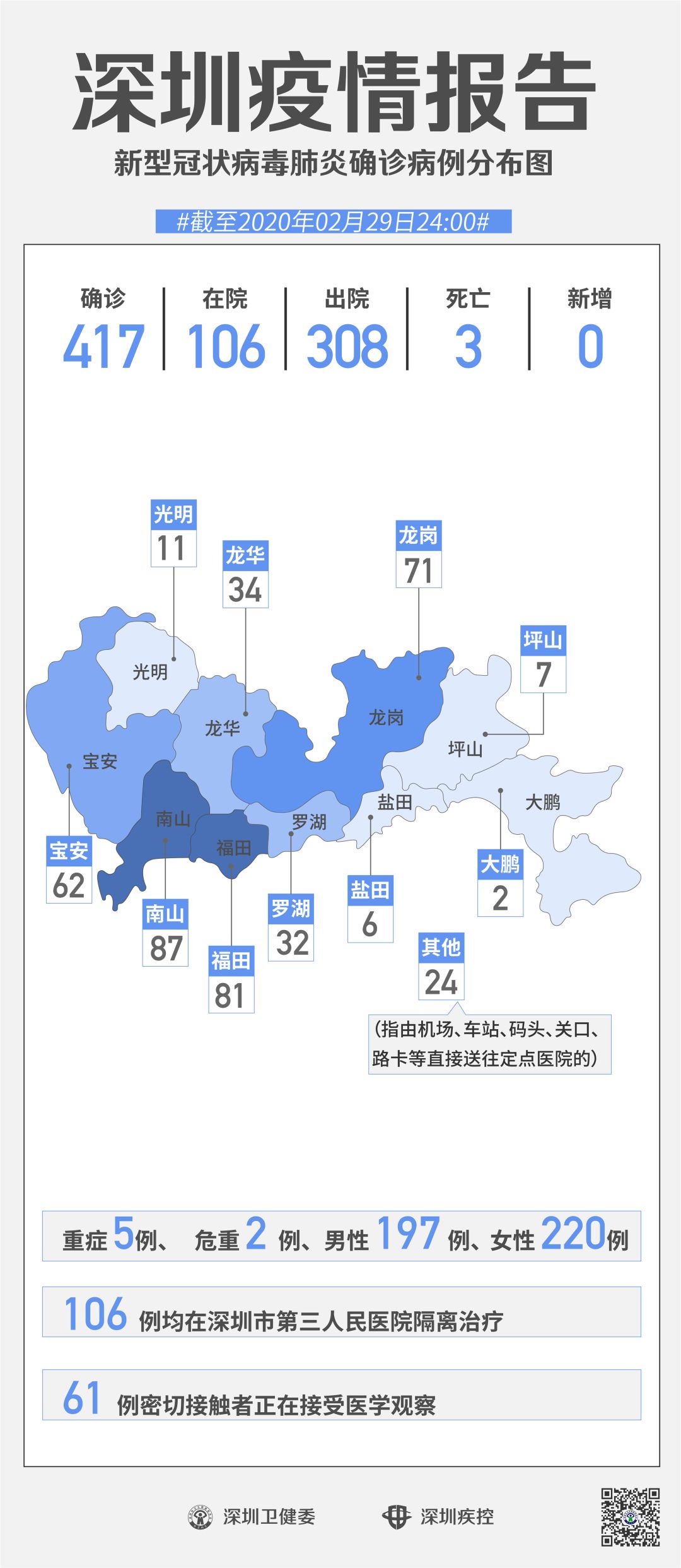 截至2月29日24時,深圳累計報告“新冠肺炎”確診病例417例。2月29日當(dāng)天全市無新增確診病例,當(dāng)天出院病例9例(從26日起不再公布出院個案)。