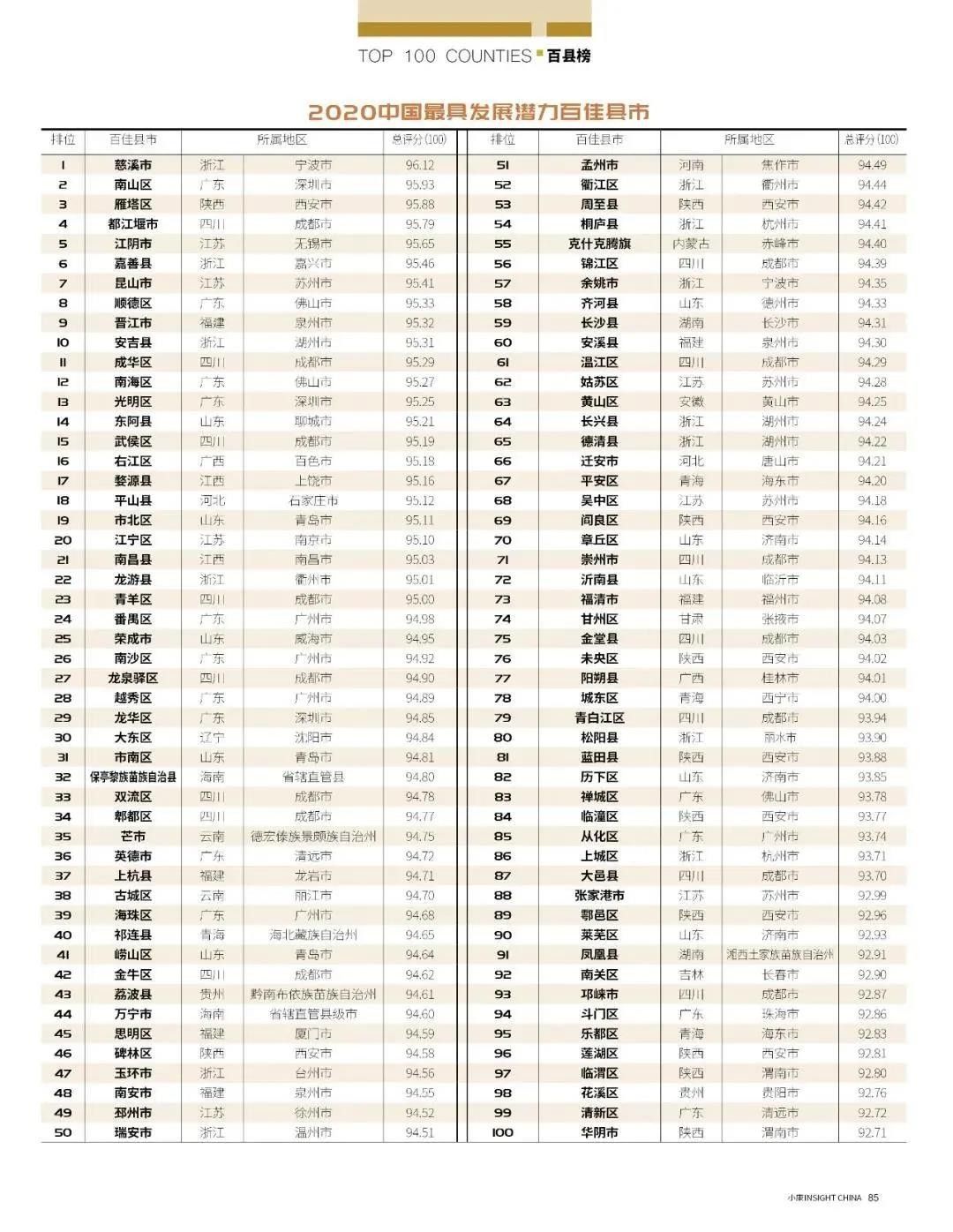 評(píng)選實(shí)際涵蓋全國(guó)2663個(gè)縣域行政單位(疫情發(fā)生地省份不參與)。榜單前十位中,廣東占有兩席,分別為深圳市南山區(qū)和佛山市順德區(qū)。南山區(qū)總分95.93分,其中特質(zhì)分為19.88,網(wǎng)絡(luò)分39.74、民意分16.54分、專家分19.77。