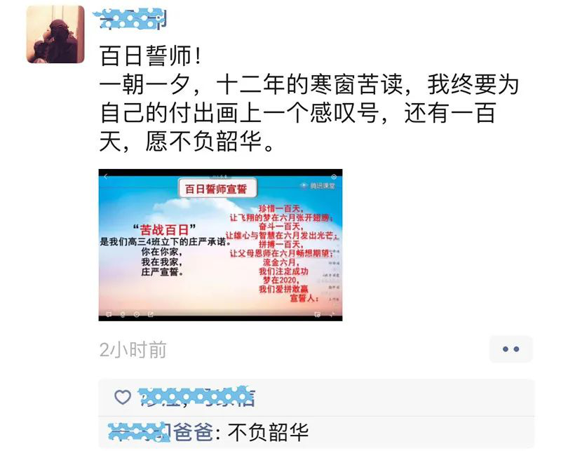 “生于非典,考于新冠,2020,我們注定不凡!疫情當(dāng)前,雖然我們隔離在家,不能像往屆那樣,齊聚學(xué)校體育館舉行誓師大會(huì),意氣風(fēng)發(fā)地走進(jìn)學(xué)校精心準(zhǔn)備的“成功門”,伴隨奮進(jìn)的樂(lè)聲高喊出我們的誓言,在“簽名紀(jì)念墻”上寫下對(duì)未來(lái)的期盼。但即使相隔網(wǎng)絡(luò)兩端,我們依然有老師祝福和引導(dǎo),有家長(zhǎng)的鼓勵(lì)和支持,有同窗的幫助和陪伴,高考百日,我們?nèi)栽谝黄鹫癖鄹吆簦?020高考,我們準(zhǔn)備好了?!?/p>
