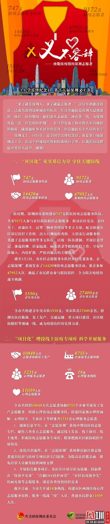 據(jù)了解,防疫期間,深圳團(tuán)市委組建747支防疫志愿服務(wù)隊(duì)伍,共9172人參與社區(qū)聯(lián)防聯(lián)控志愿服。截至3月2日,各社區(qū)志愿服務(wù)小隊(duì)經(jīng)社區(qū)黨委備案,在“志愿深圳”系統(tǒng)發(fā)布了14428項(xiàng)防疫志愿服務(wù)活動,累計(jì)參加47952人次。在深圳戰(zhàn)“疫”的關(guān)鍵時(shí)刻,全市共組建青年突擊隊(duì)1550支,突擊隊(duì)員27400余人,拼搏在醫(yī)療救助、復(fù)工復(fù)產(chǎn)、交通運(yùn)輸、重大項(xiàng)目建設(shè)、社區(qū)聯(lián)防聯(lián)控等領(lǐng)域一線,成為疫情防控的先鋒力量。