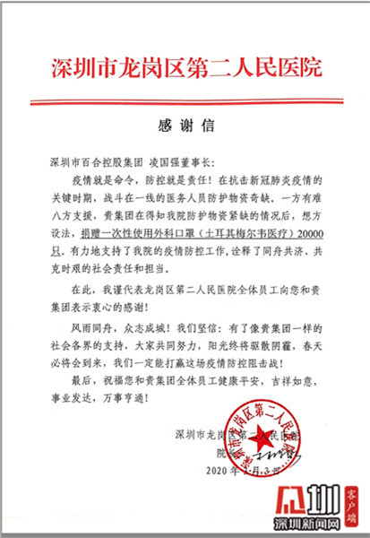 “我不認(rèn)識你,但我要謝謝你!”3月2日,龍崗區(qū)第二人民醫(yī)院院長林源泉還特地向百合集團凌國強董事長寫了一封感謝信。