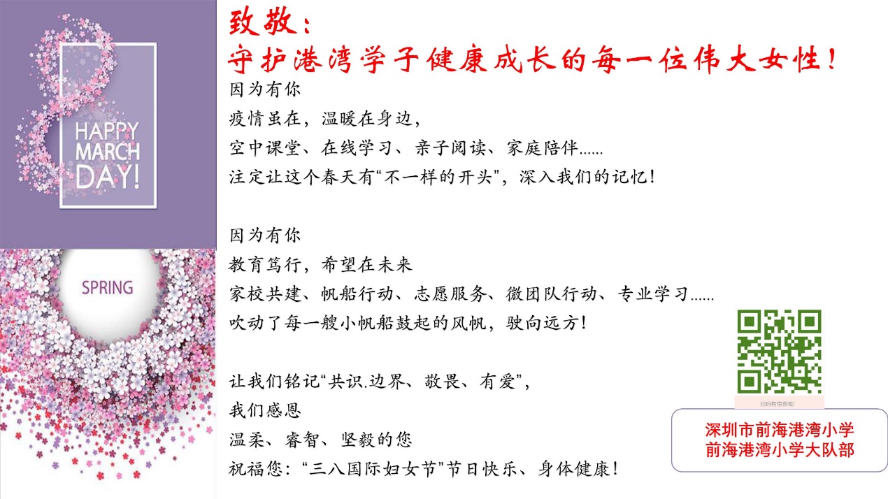 3月8日,“國(guó)際婦女節(jié)”,在這個(gè)特殊的節(jié)日里,前海港灣小學(xué)又是怎樣給“女神們”過(guò)節(jié),學(xué)校又送了哪些溫馨的祝福,一起來(lái)看一看: