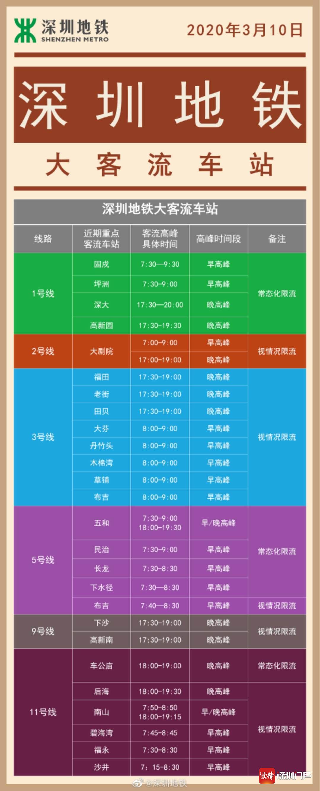 深圳特區(qū)報2020年3月11日訊 記者從深圳地鐵獲悉,截至3月10日(周二),深圳地鐵所轄7條線路已有26座車站在高峰期出現(xiàn)較大客流。為避免客流聚集擁擠,本周起深圳地鐵將對11座大客流站點實施常態(tài)化客流管控、17座重點車站采取視情況客流管控。此外,深圳地鐵還梳理了5個高峰擁擠區(qū)段,并在站外設(shè)置“安全距離”標識,以便市民提前規(guī)劃出行路線、避免排隊擁擠。