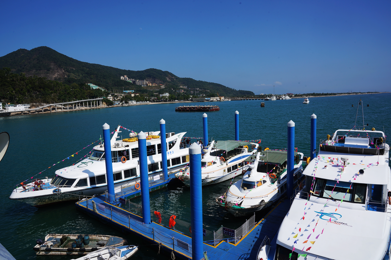 ??吭邴}田金色海岸碼頭處運營游船。韋建誠攝