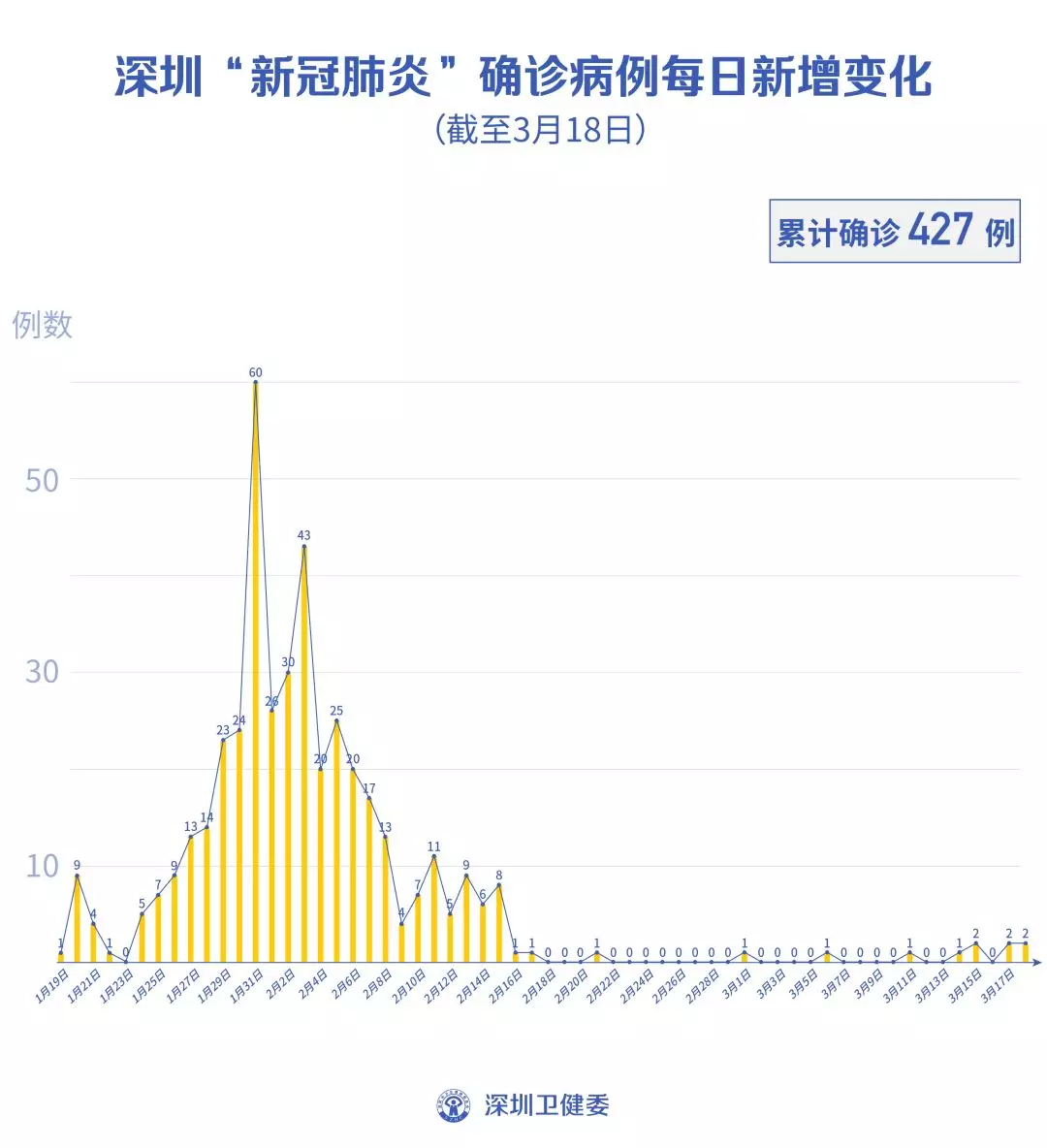 截至3月18日24時,深圳累計報告“新冠肺炎”病例427例。3月18日當天新增2例,出院4例。