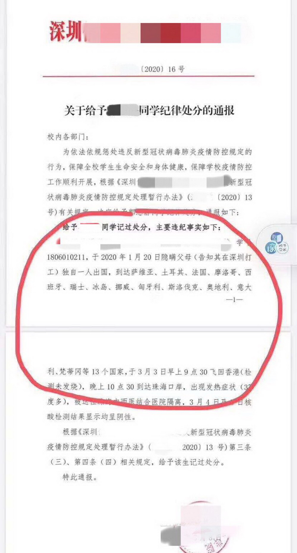 3月3日,小Y從珠海入境回國(guó),在過海關(guān)時(shí)出現(xiàn)發(fā)燒癥狀并送往珠海中西醫(yī)結(jié)合醫(yī)院進(jìn)行隔離檢測(cè)?!霸谶^關(guān)的時(shí)候需要填寫旅行史,我如實(shí)填寫了,因?yàn)樵?jīng)到過意大利等國(guó)家所以海關(guān)會(huì)重點(diǎn)監(jiān)測(cè)我。因?yàn)樽陨砻庖吡Φ停约暗箷r(shí)差的原因,有些感冒低燒,但我也沒有隱瞞什么,如實(shí)闡述了我的行程和身體狀況,也很配合海關(guān)人員的調(diào)查。”3月4日、5日,當(dāng)事人核酸檢測(cè)結(jié)果均為陰性,由于違反定瞞報(bào)行程,小Y被學(xué)校予以記過處分。對(duì)于學(xué)校的處分決定,她坦言接受?!拔覜]有如實(shí)向?qū)W校匯報(bào)我的行程,我接受學(xué)校對(duì)我的處分。”