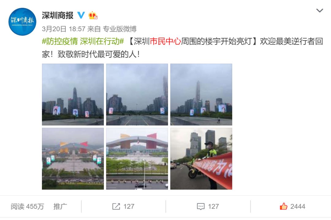 單條微博【深圳市民中心周?chē)臉怯铋_(kāi)始亮燈】閱讀數(shù)455萬(wàn)+,引起了廣泛關(guān)注。