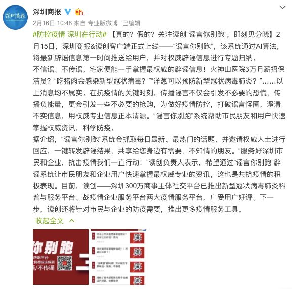 疫情發(fā)生初期,深圳商報(bào)微博創(chuàng)建話題 #防控疫情 深圳在行動(dòng)# ,以高度的責(zé)任感和使命感全方位加強(qiáng)宣傳報(bào)道和輿論引導(dǎo),疫情相關(guān)信息均帶話題發(fā)布,人們可以系統(tǒng)地查看疫情相關(guān)信息。