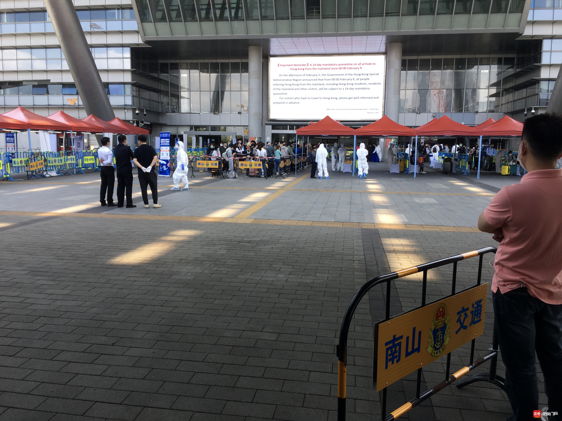 深圳特區(qū)報2020年3月24日訊 為加強疫情防控,自3月24日零時起,從深圳各大口岸來深的所有旅客均需進行核酸檢測采樣。記者昨日13時許到達深圳灣口岸北廣場,剛到聯(lián)檢大樓外就聞到消毒水的味道,入境廳門口排起了“S”形隊伍,所有旅客通關(guān)增加了一道“關(guān)口”:核酸檢測。多數(shù)旅客表示,整個通關(guān)過程需要3小時左右,但對嚴(yán)格篩查也表示理解。
