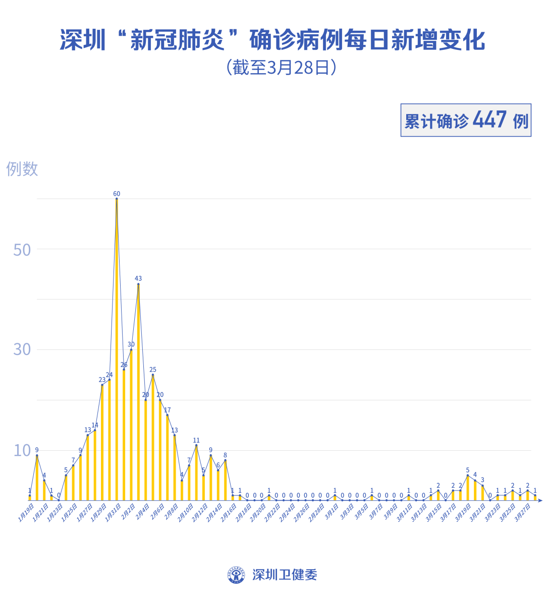 截至3月28日24時(shí),深圳累計(jì)報(bào)告“新冠肺炎”病例447例。3月28日當(dāng)天新增1例。