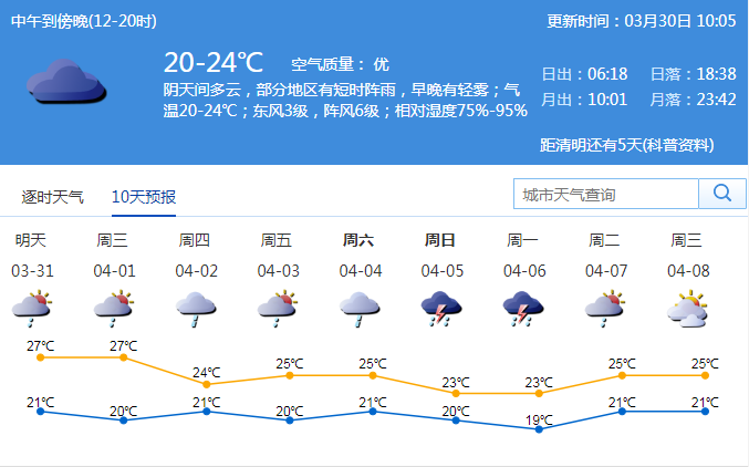 市氣象臺(tái)預(yù)測(cè),31日至4月1日有陣雨或雷陣雨;2-3日多云到陰天,部分時(shí)間有分散小雨;展望清明假期期間,有明顯降雨過(guò)程。注意雨霧天氣低能見(jiàn)度對(duì)交通安全的影響。