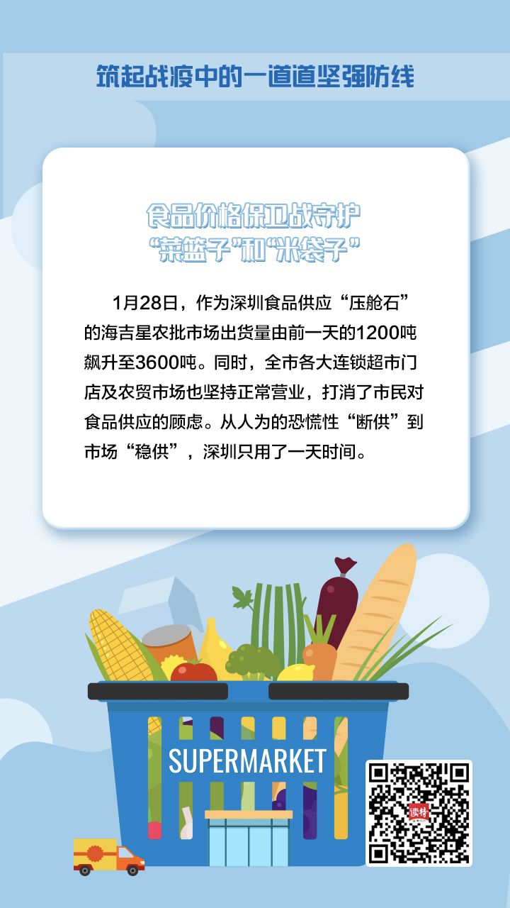 “食品價(jià)格保衛(wèi)戰(zhàn)”第一槍在1月27日打響。當(dāng)天,市菜籃子工程領(lǐng)導(dǎo)小組召集各大商超市場(chǎng)責(zé)任人開(kāi)會(huì),制定詳細(xì)的作戰(zhàn)計(jì)劃。1月28日,作為深圳食品供應(yīng)“壓艙石”的海吉星農(nóng)批市場(chǎng)出貨量由前一天的1200噸飆升至3600噸。同時(shí),全市各大連鎖超市門(mén)店及農(nóng)貿(mào)市場(chǎng)也堅(jiān)持正常營(yíng)業(yè),打消了市民對(duì)食品供應(yīng)的顧慮。從人為的恐慌性“斷供”到市場(chǎng)“穩(wěn)供”,深圳只用了一天時(shí)間。