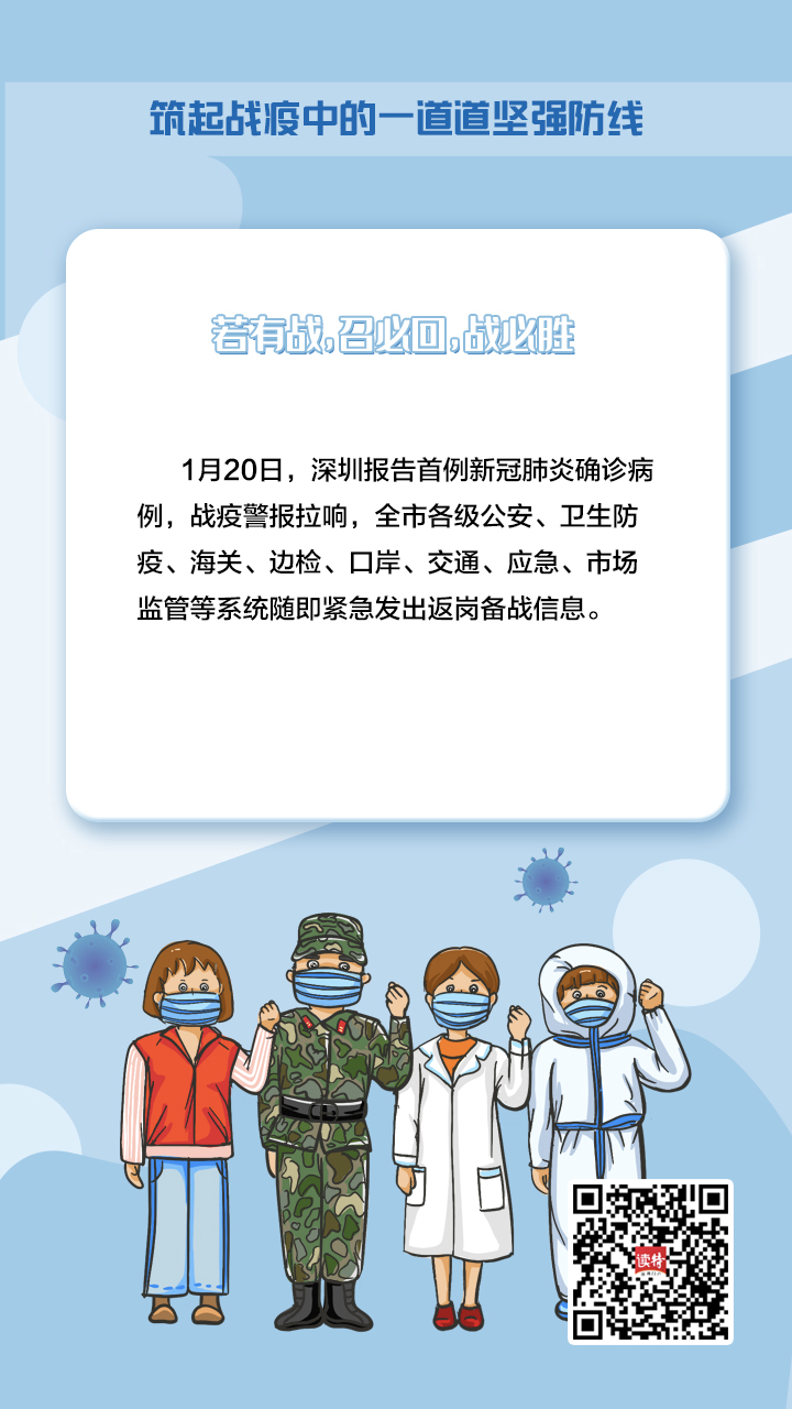 牢記習(xí)近平總書(shū)記的重要指示,深圳在新冠肺炎疫情防控的人民戰(zhàn)爭(zhēng)、總體戰(zhàn)阻擊戰(zhàn)中,鑄造了一支由不同“兵種”、精銳之師組成的守護(hù)者隊(duì)伍,堅(jiān)定地筑起一道堅(jiān)強(qiáng)屏障,守護(hù)好城市“外防輸入、內(nèi)防擴(kuò)散”的門(mén)戶。