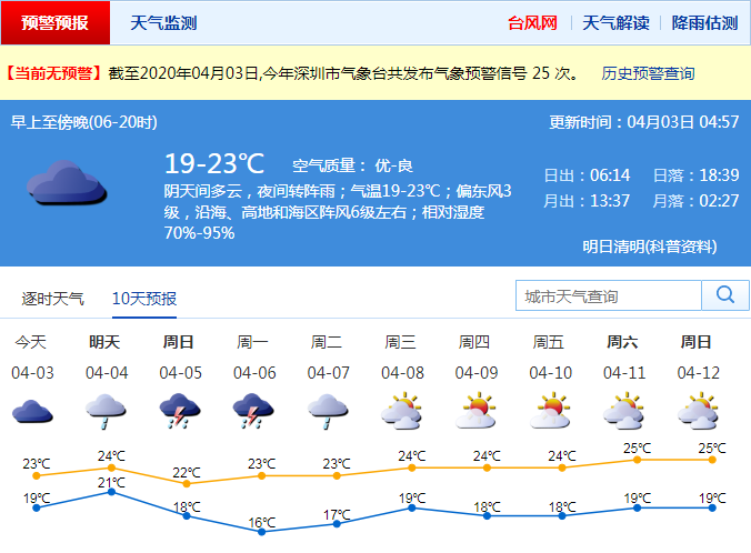 見圳客戶端·深圳新聞網(wǎng)2020年4月3日訊 深圳今日陰天間多云,夜間轉(zhuǎn)陣雨;氣溫21-23℃;偏東風3級,沿海、高地和海區(qū)陣風6級左右;相對濕度70%-95%。清明假期4-6日有一次明顯降雨過程,并伴有雷暴,氣溫下降,其中4日有(雷)陣雨,5-6日有中到大雨局部暴雨;7日降雨減弱,轉(zhuǎn)多云。