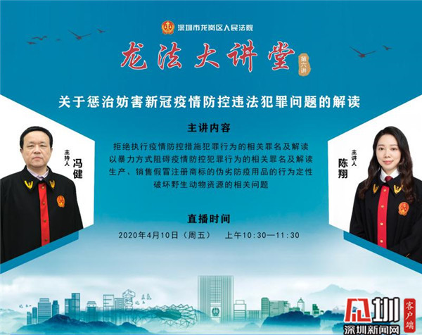 見圳客戶端·深圳新聞網4月10日訊(見圳客戶端、深圳新聞網記者 李云云 通訊員 張建國)4月10日上午,龍崗法院“龍法大講堂”上線第六講,再次以直播方式,就妨害疫情防控違法犯罪問題向觀眾進行詳細解讀。