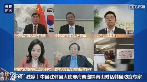 4月10日15時,中國駐韓國大使邢海明邀請鐘南山院士與韓國防疫專家李鐘求教授在線交流。鐘南山專門制作了一個題為“抗擊新冠肺炎的中國經(jīng)驗”的PPT,向韓國朋友介紹中國經(jīng)驗。
