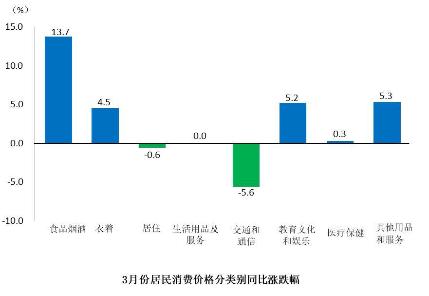八大類商品和服務同比價格五升二降一平,食品煙酒價格上漲13.7%,其他用品和服務價格上漲5.3%,教育文化和娛樂價格上漲5.2%,衣著價格上漲4.5%,醫(yī)療保健價格上漲0.3%;交通和通信價格下降5.6%,居住價格下降0.6%;生活用品及服務價格持平。