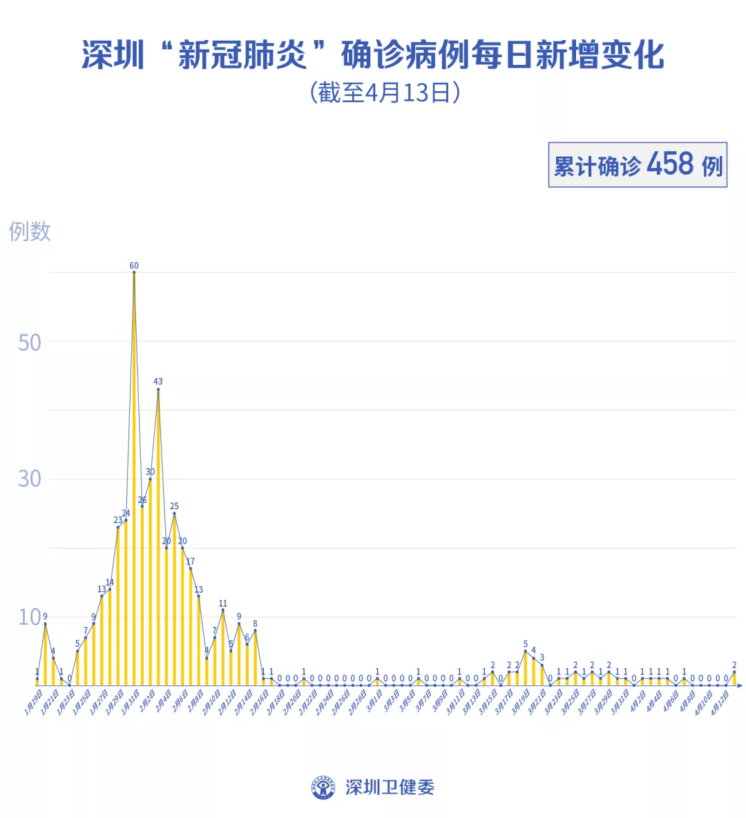 截至4月13日24時(shí),深圳累計(jì)報(bào)告新冠肺炎病例458例。4月13日當(dāng)天新增2例境外輸入病例,新增無癥狀感染者1例,出院1例。