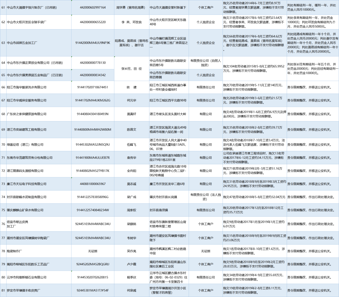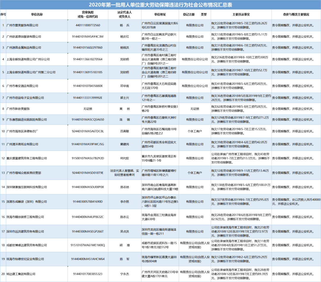 為加強(qiáng)對(duì)違法用人單位的社會(huì)監(jiān)督,強(qiáng)化誠(chéng)信體系建設(shè),加大威懾力,依據(jù)《廣東省用人單位重大勞動(dòng)保障違法行為社會(huì)公布暫行規(guī)定》,省人社廳公布2020年第一批重大違法案件,涉及81家企業(yè),其中深圳豬兼強(qiáng)互聯(lián)網(wǎng)科技有限公司拖欠138名勞動(dòng)者2019年5-6月工資約100.01萬(wàn)元,涉嫌拒不支付勞動(dòng)報(bào)酬罪,被責(zé)令限期整改,并移送公安機(jī)關(guān)。深港東成睡袋(深圳)有限公司拖欠327名勞動(dòng)者2019年6-7月工資約295.8萬(wàn)元,涉嫌拒不支付勞動(dòng)報(bào)酬罪,被責(zé)令限期整改,處以罰款人民幣4萬(wàn)元,并移送公安機(jī)關(guān)。