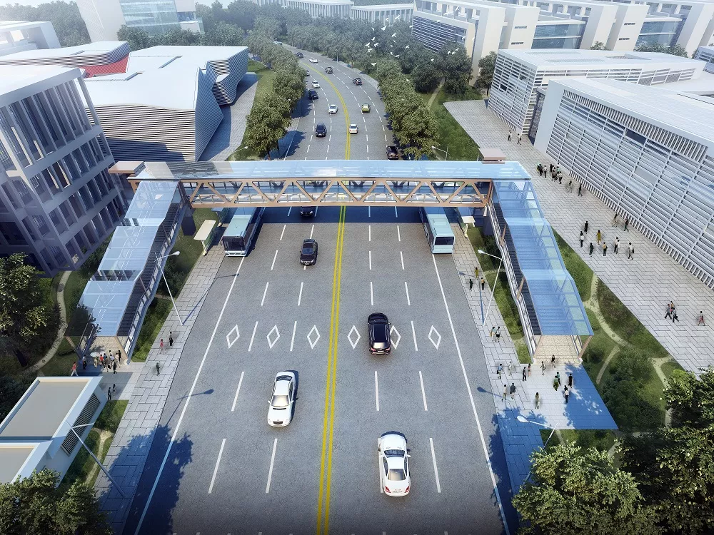 跨越南山區(qū)沙河西路,西接大沖片區(qū),東接沙河西生態(tài)長廊,橋長約113米,橋面凈寬約4.3米,主橋共4跨。天橋設(shè)計容景觀、造型、燈光、周邊環(huán)境于一體,設(shè)置無障礙觀光電梯,采用鋼箱梁及花崗巖面磚鋪裝、綠化自動滴灌等。天橋的建設(shè)將大大縮短居民繞行時間,對完善周邊居民出行環(huán)境具有重要意義。