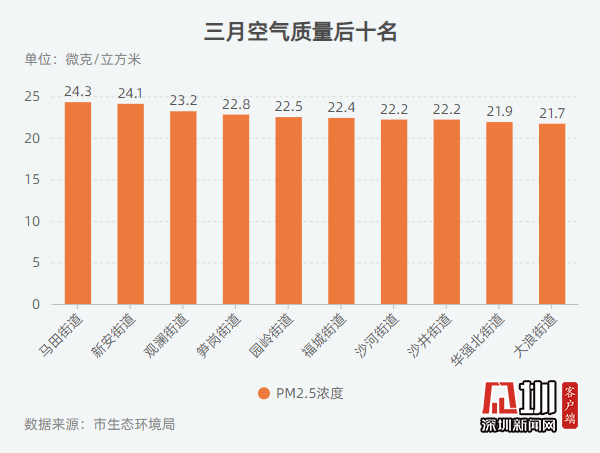 記者從深圳市生態(tài)環(huán)境局獲悉,2020年3月,全市74個街道PM2.5濃度在14.6-24.3微克/立方米之間,均值為19.0微克/立方米。