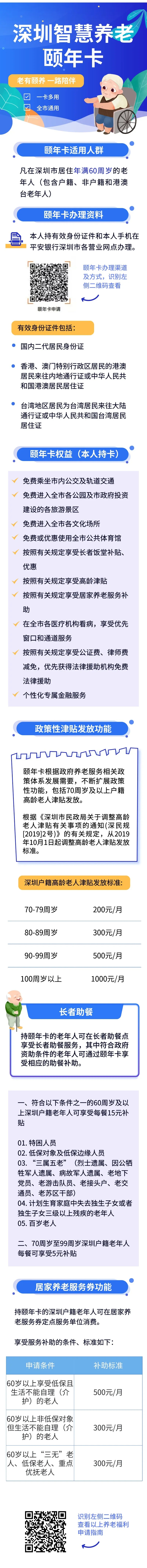 據(jù)悉,凡在深圳市居住年滿60周歲以上的老年人(包含港澳臺老年人),均可持有效身份證件和手機申請辦理?!邦U年卡”持卡人,可享受敬老優(yōu)待,包括免費進入全市各公園,免費進入市政府投資建設(shè)各旅游景區(qū),免費乘坐市內(nèi)公交車和軌道交通。70周歲及以上戶籍老人還可享受高齡津貼發(fā)放;符合規(guī)定的戶籍老年人可享受居家養(yǎng)老消費的優(yōu)惠和補貼,包括:生活照料、家政服務(wù)、康復(fù)護理服務(wù)、日托服務(wù)、心理咨詢等。
