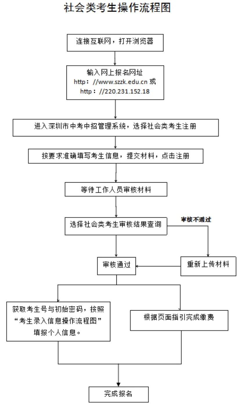見(jiàn)圳客戶(hù)端·深圳新聞網(wǎng)2020年4月30日訊 據(jù)深圳市教育局消息,2020年深圳高中階段學(xué)校招生考試(以下簡(jiǎn)稱(chēng)“中考”)報(bào)名定于5月6日-15日進(jìn)行,考試時(shí)間為7月20日-21日。 今年本市應(yīng)屆初中畢業(yè)生仍繼續(xù)在就讀學(xué)校集體辦理報(bào)名手續(xù)。符合深圳中考報(bào)名條件的深圳戶(hù)籍往屆生、在市外就讀的深圳戶(hù)籍應(yīng)屆初中畢業(yè)生(以下簡(jiǎn)稱(chēng)“社會(huì)類(lèi)考生”)采用網(wǎng)上報(bào)名方式進(jìn)行報(bào)名。 報(bào)名條件 一、具有我市戶(hù)籍的初中畢業(yè)生,可以在我市報(bào)名參加中考。 二、具有我市初三學(xué)籍的隨遷子女可以報(bào)名參加中考,同時(shí)符合以下條件的,可以參加相應(yīng)的公辦普高、民辦普高和中職學(xué)校的劃線錄取。 (一)父親或母親在我市具有合法穩(wěn)定職業(yè); (二)父親或母親在我市具有合法穩(wěn)定住所; (三)父親或母親持有有效《深圳經(jīng)濟(jì)特區(qū)居住證》; (四)父親或母親在我市繳納基本養(yǎng)老保險(xiǎn)及基本醫(yī)療保險(xiǎn),且至少其中一個(gè)險(xiǎn)種累計(jì)繳費(fèi)滿(mǎn)3年,社保累計(jì)年限計(jì)算截至2020年8月31日; (五)隨遷子女在我市具有3年完整初中學(xué)籍。 不符合上述條件但具有我市初中學(xué)籍的隨遷子女,可以在我市參加中考,但僅限于參加民辦普高補(bǔ)錄或中職學(xué)校注冊(cè)入學(xué)。 三、高中階段學(xué)校在校生不得報(bào)名。 本市應(yīng)屆初中畢業(yè)生報(bào)名辦法 本市應(yīng)屆初中畢業(yè)生于5月6日至7日在就讀學(xué)校集體辦理報(bào)名手續(xù)。 今年中考繼續(xù)實(shí)行網(wǎng)上報(bào)名。要求各學(xué)校開(kāi)放計(jì)算機(jī)房,為本校考生上網(wǎng)報(bào)名提供方便。 5月8日至15日,學(xué)校組織考生進(jìn)行電子攝像,學(xué)校和考生分別上網(wǎng)錄入報(bào)名信息,考生錄入信息可參考“考生錄入信息流程圖”進(jìn)行操作。 市教育局強(qiáng)調(diào),學(xué)校不得以任何理由拒絕有本校學(xué)籍的應(yīng)屆畢業(yè)生報(bào)考(參加中職學(xué)校自主招生、注冊(cè)入學(xué)的考生,也須報(bào)名參加中考)。如有違反者,將嚴(yán)肅查處,并追究相關(guān)人員責(zé)任。同時(shí)要求各區(qū)有關(guān)職能部門(mén)、各有關(guān)學(xué)校(報(bào)名點(diǎn))要嚴(yán)格審查報(bào)名材料。對(duì)不符合報(bào)名條件、弄虛作假而被錄取的考生,一經(jīng)發(fā)現(xiàn),取消其錄取資格;已經(jīng)到錄取學(xué)校報(bào)到注冊(cè)的,取消其學(xué)籍,并追究相關(guān)人員責(zé)任。 社會(huì)類(lèi)考生報(bào)名辦法 社會(huì)類(lèi)考生采用網(wǎng)上報(bào)名方式進(jìn)行報(bào)名。報(bào)名考生需在5月6日至15日登錄報(bào)名網(wǎng)址(http://www.szzk.edu.cn/),按照提示進(jìn)行網(wǎng)上注冊(cè),上傳報(bào)名審核資料,由考生戶(hù)籍所在區(qū)社會(huì)報(bào)名點(diǎn)進(jìn)行線上審核,審核通過(guò)后系統(tǒng)將生成中考考生號(hào)及初始密碼,考生需用獲取的考號(hào)及密碼登錄中考中招管理系統(tǒng),填寫(xiě)個(gè)人信息,具體操作可參考“考生錄入信息流程圖”。同時(shí)需在報(bào)名截止前根據(jù)指引完成網(wǎng)上繳費(fèi)。 若考生網(wǎng)上報(bào)名審核不通過(guò),需按照系統(tǒng)的不通過(guò)原因提示,重新補(bǔ)充審核資料,如多次上傳資料失敗或?qū)徍瞬煌ㄟ^(guò),考生可撥打戶(hù)籍所在區(qū)的社會(huì)報(bào)名點(diǎn)電話進(jìn)行咨詢(xún)或電話預(yù)約,按照工作人員指示進(jìn)行操作報(bào)名,不要在未預(yù)約的情況下前往社會(huì)報(bào)名點(diǎn),盡量避免出行,減少人員聚集。 社會(huì)類(lèi)考生操作流程如下圖: